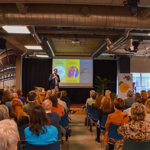 Speels netwerken, grappige arbeidsmarktquiz een gezellige sfeer en vooral het inspirerende levensverhaal van Joy Moonen. Zo’n 60 JobOn ambassadeurs vierden afgelopen 14 februari het 10 jarige jubileum van Stichting JobOn in het Utrechtse Seats2Meet.